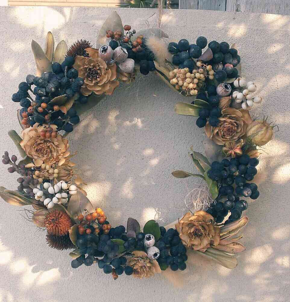 去年のシャリンバイがカラカラドライになったので、ドライフラワーを使ってリースに。