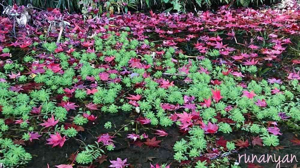 水面には、落ちたばかりの赤いもみじと、正体不明の植物の緑が鮮やかでとても綺麗でした(≧▽≦)