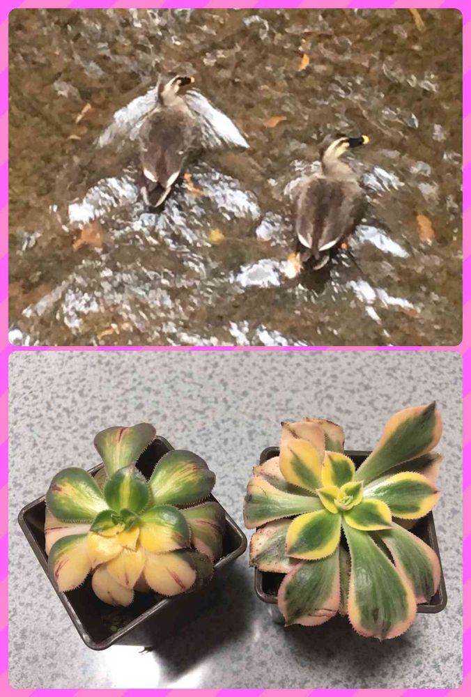 今日ダイソーで出会ったアエオニウム🍀右はサンバースト?左のは?緑と白の色が逆転してるんだよなぁ。左の子は誰でしょう?