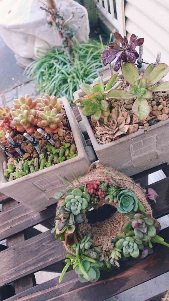 左の寄せ植えの柵の後ろで綺麗に紅葉してる多肉さんは、だぁれ❓