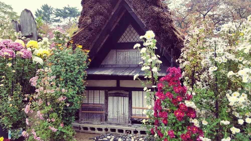 名古屋城で菊に囲まれた合掌造り発見( ゚□゚)