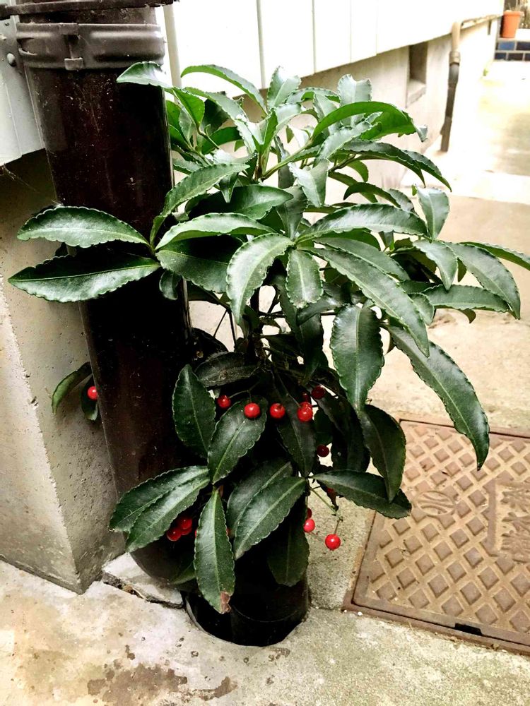 トイの排水溝 犬走りのコンクリートの間から自然に根付き赤い実が付いています😄✌️鳥さんが実を運んできたのかな?