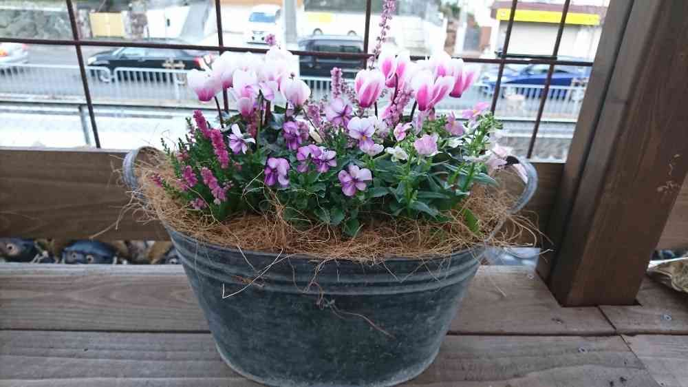 軽井沢育ちガーデンシクラメン“雪うさぎ”、霧島からの贈り物“夢咲きヴィオラ”、八重咲きカルーナ・ブルガリス、宿根ネメシア“アレンジピンク”です。