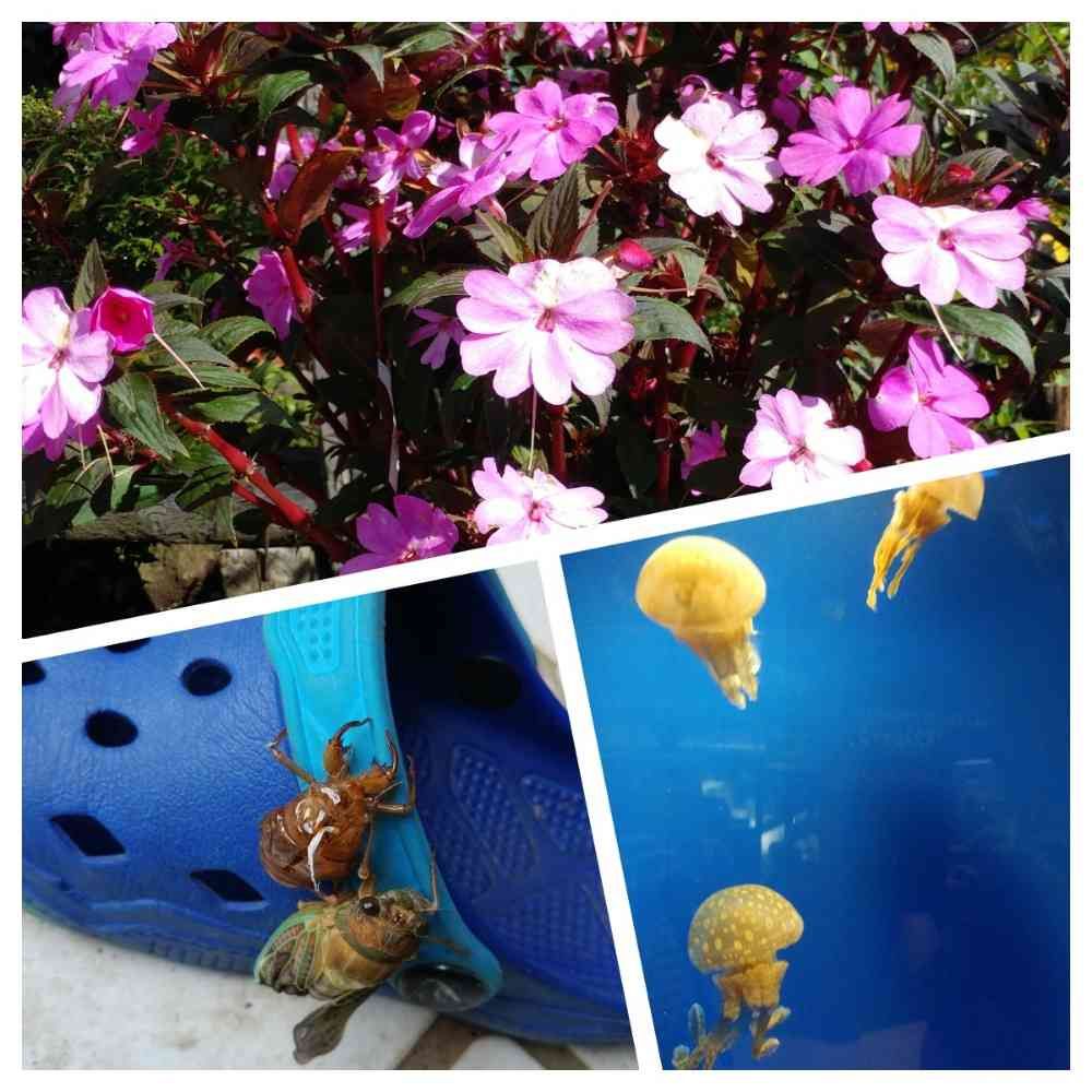 猛暑の中元気に咲いてるサンパチェンス・蝉の脱皮・涼しげな水族館のクラゲ👾