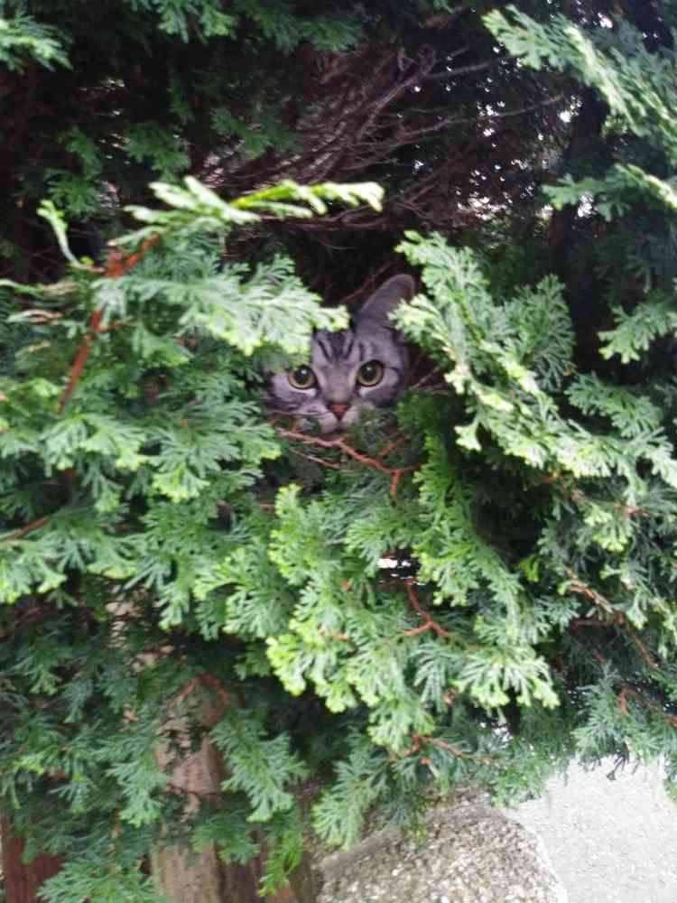 玄関脇のチャボヒバの中で散歩から帰ってくるのん待って居ます