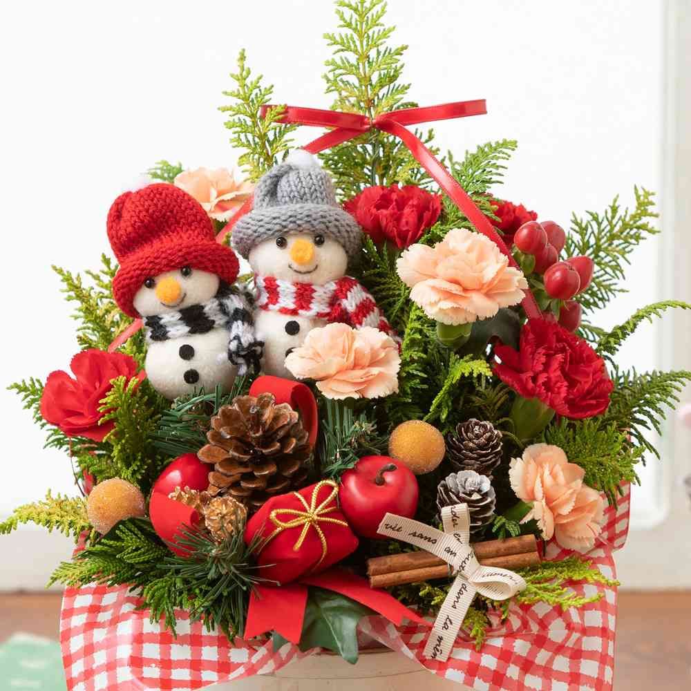 サンタや雪だるまの愛らしいツリー型のアレンジメントや、