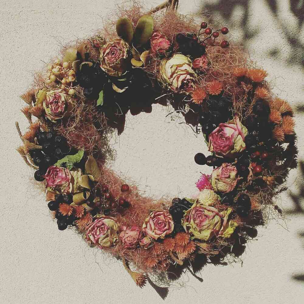 バラのドライフラワーを使ってリースにしました。今朝は朝から野バラの実を取りに河原へ。