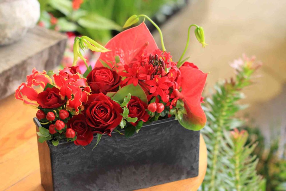 赤バラをポイントにしてアンスリウム、グロリオサなど個性的なお花でまとめました(*˘︶˘*).。.:*♡