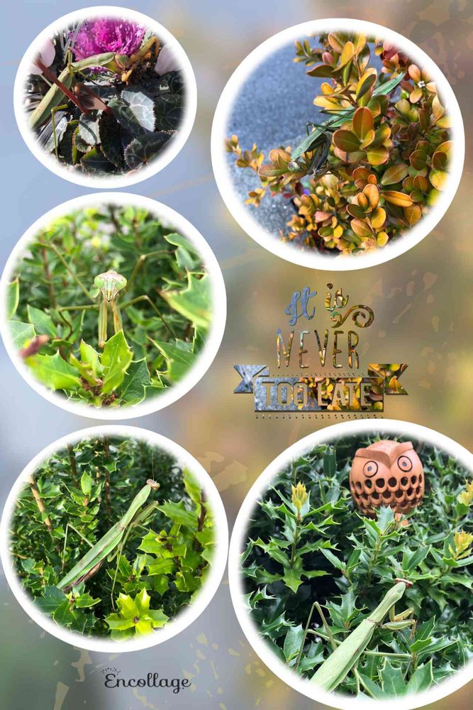 11/2からずーっとポスト脇の姫ヒイラギの木にいたカマキリ君