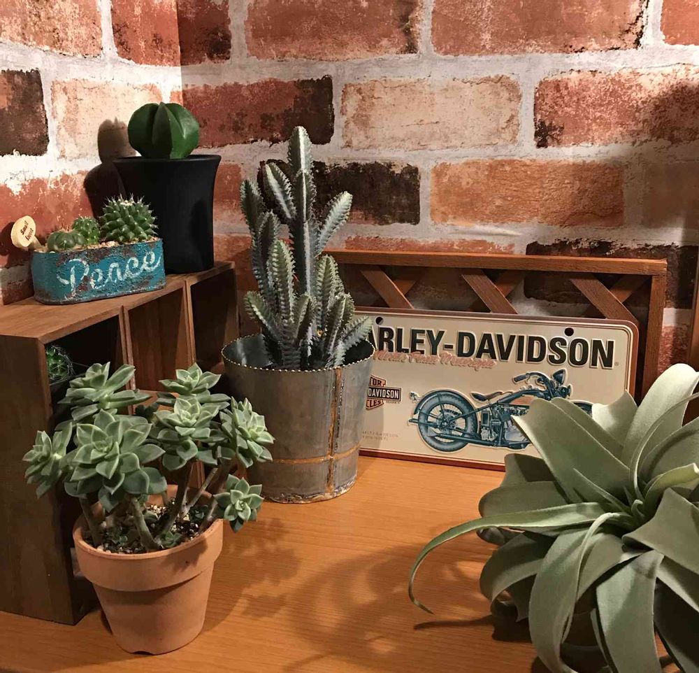 キセロとユーフォルビアがフェイクで、あとは本物です🍀レンガ風の壁紙を貼ってみたりして、いつもと違う、ちょっと男前よりなイメージでディスプレイしてみました😉🎶