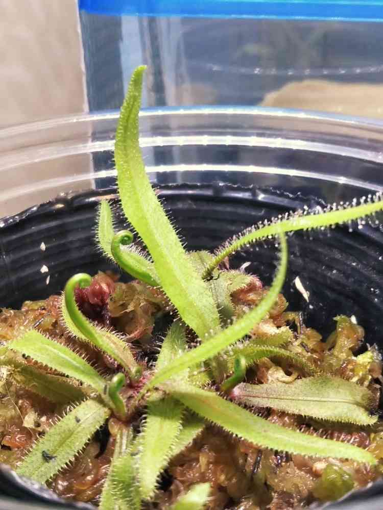 コバエ取りとして簡易温室に入れてるドロセラ・アデラエさん、粘液キラキラ✨
