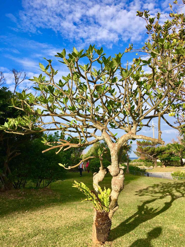 先日、沖縄へ旅行した際にホテルの庭で見つけたプルメリアの木。