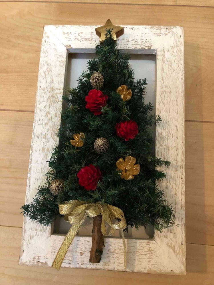 大きなツリーを飾るのは大変なので、ミニサイズで額に入れたデザインで作りました😊