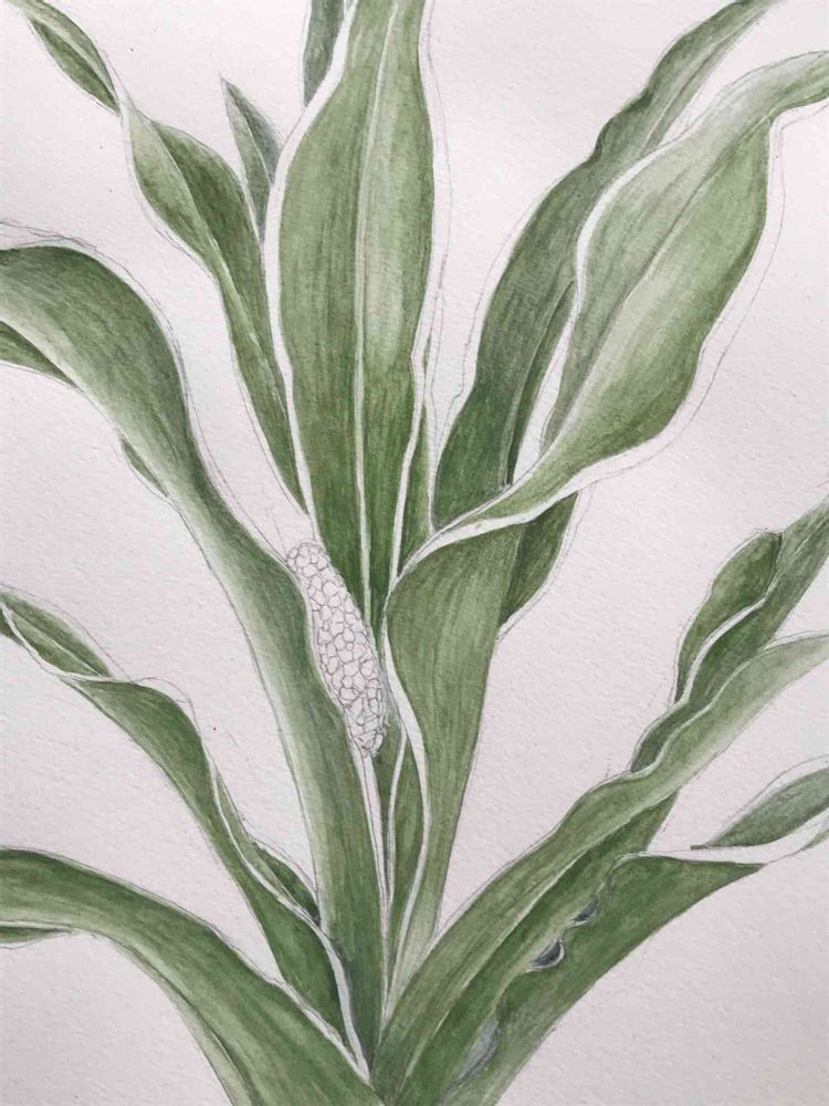hideさんの作品と比べたら笑止千万ですが😂マユハケオモトやヤツデなどの光沢のある葉っぱを描きたいと思ってトライしてます。
