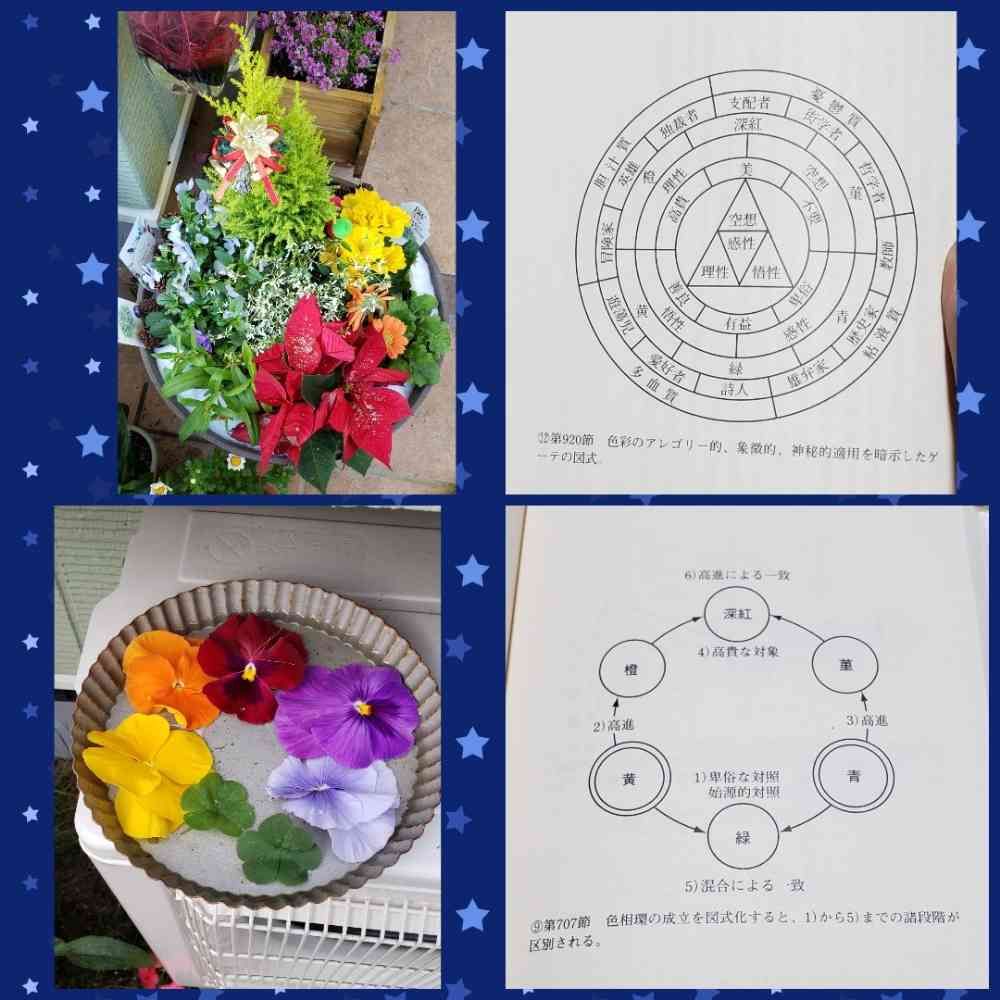 左二枚は、色相環の図にしたがって、私自身がどう感じるか、家族やこの寄せ植えを見たひとが、どう感じるかを聞き取っています。