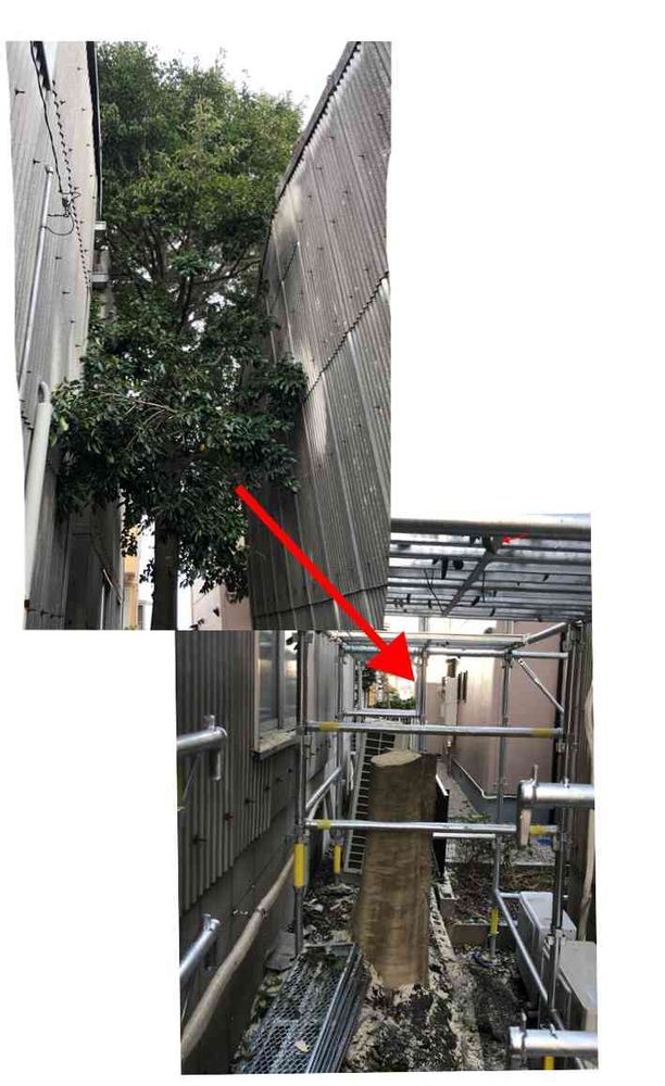 うちの工場🏭のお隣さんですが、通路に大きな木がありまして、大きくなり過ぎてアスファルトが持ち上がってしまったり、台風の度に大量の葉っぱを落としたりとなかなか困った事が多く、ついに切ってしまいました。