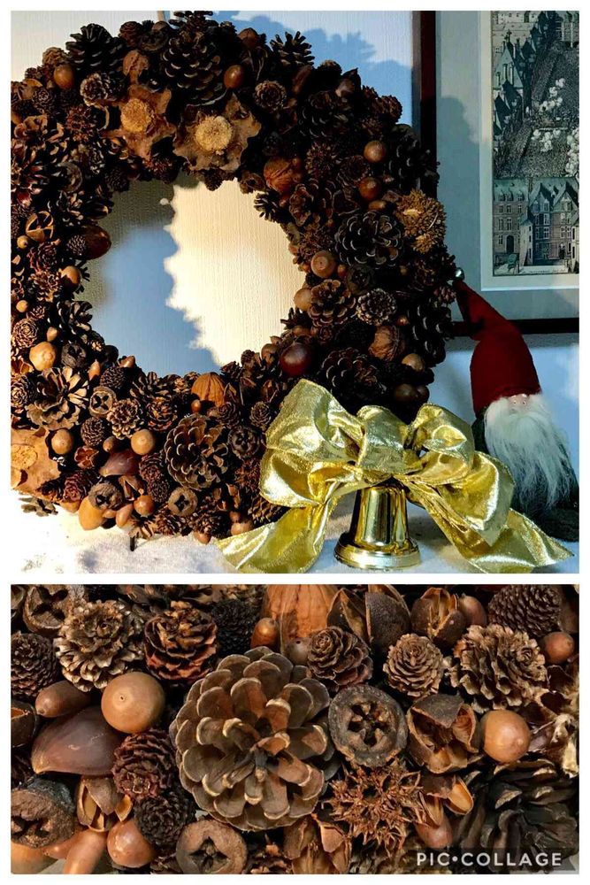 このリースの反対側の洗面所の扉の上にはもっと大きいドライのリースあります。お祝いとかの花輪みたいです😅習っていた先生は大きい作品が好きみたいです。木の実のツリーも高さ50㎝くらいの押入れに…みんな同じ頃、作りました。
