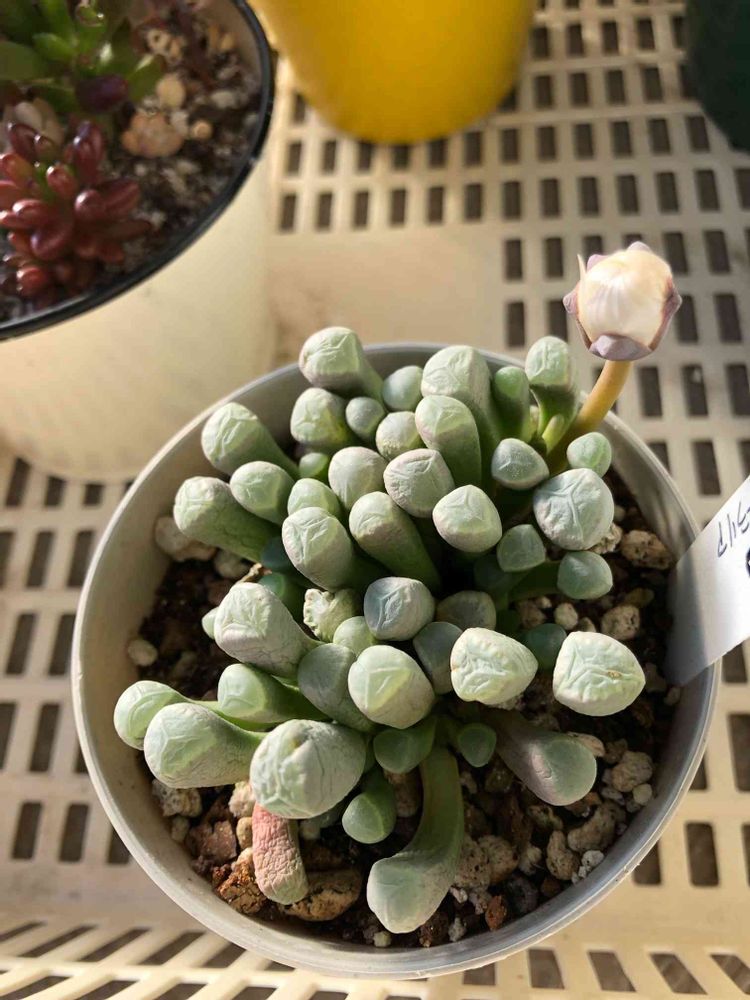 去年、黄色い花を咲かせたから「五十鈴玉」と名札を立てた子。