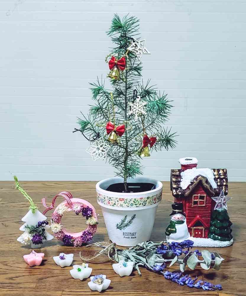 家の即席クリスマスツリーと100均で買ったオブジェを添えて撮ってみました。😄🎶