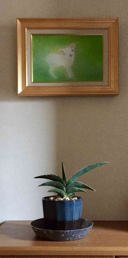 ウチの玄関デス。鉢は色々取り替えますが、今回はロブスタブルー🦞、絵はいつも同じで片岡の鶴ちゃんの子羊🐑です☺️