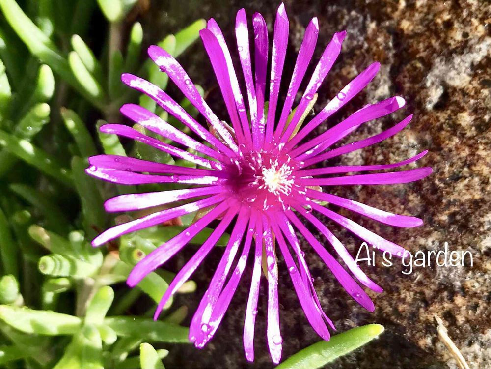 松の下のグランドカバーとして横に広がる葉は多肉質。お花の形は扇風機みたいです…(^.^)