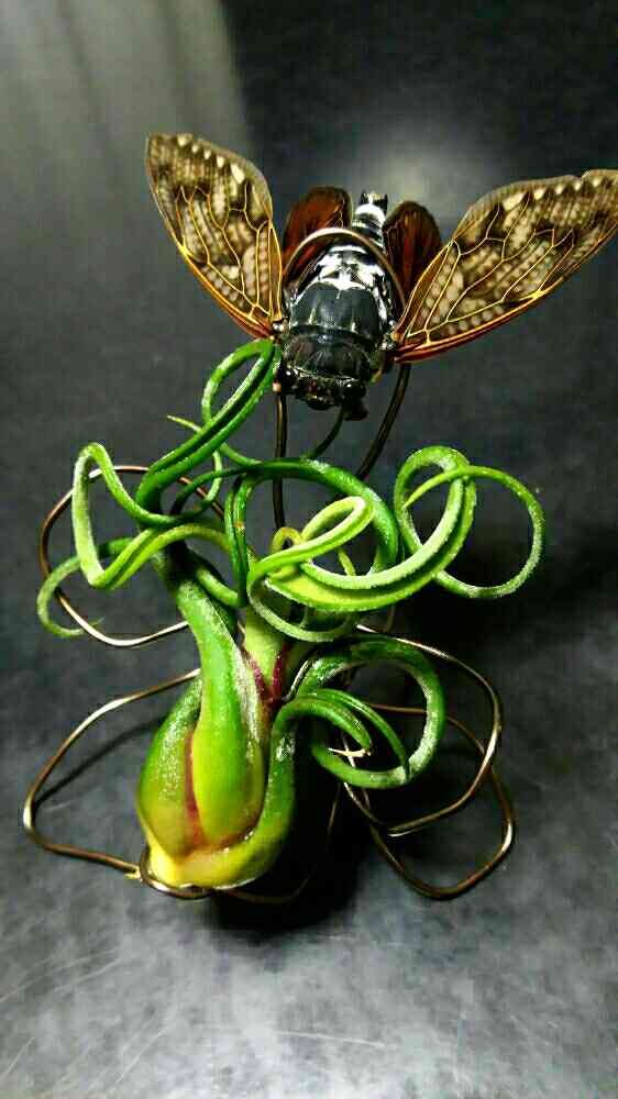 初めて蝉を段ボールに画ビョウで羽の角度を固定してボンドでとめ、針金で台座を作り、今日出会ったメディーサとの作品にたどり着いた❗