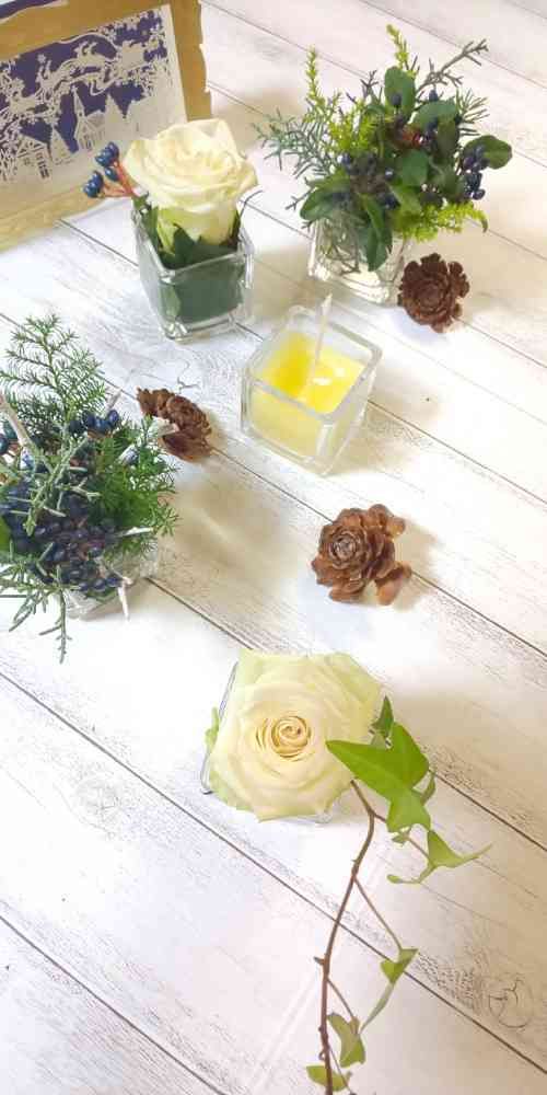 薔薇のアレンジメントでまだきれいな状態の白薔薇とリースのあまりのグリーンで、玄関の飾りつけをしました😄