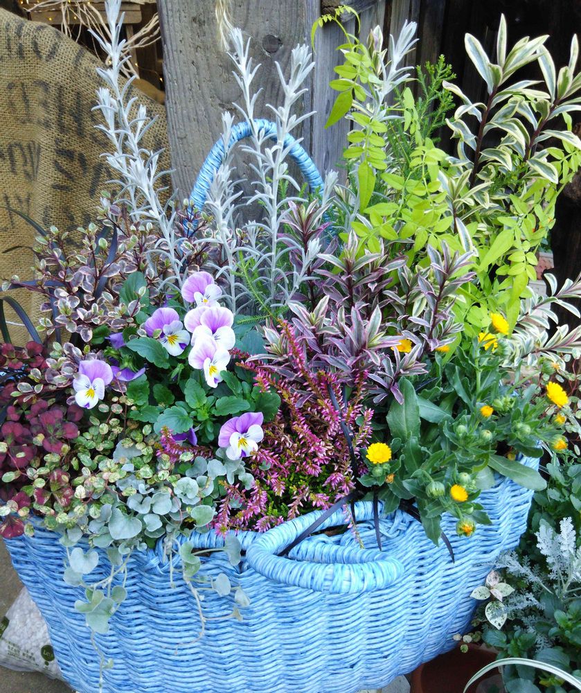 水色のバスケットが可愛い、素敵な寄せ植え。