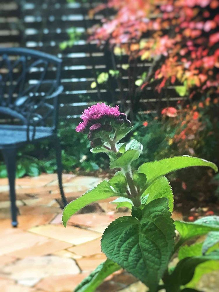 後ろのブルーベリーの紅葉🍁と季節はずれのお花を眺めながら素敵なガーデンで、まったりお茶を飲む……癒やしの空間ですね〜😄
