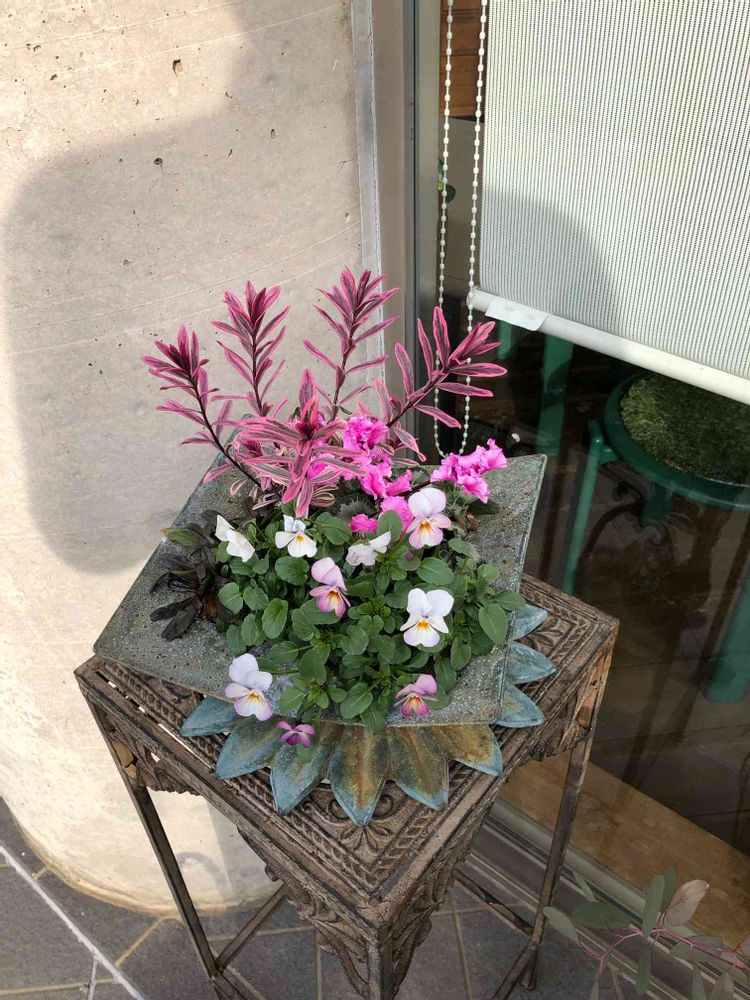 先の日曜日に隣町美濃加茂市の喫茶レストラン「ミエル」に行ってみた。レストランの外に何気ない鉢植えがあった。全体の花などの白とピンクの色合いといい、テーブルから容器までとても品が良い。孫とレストランのテラス前の芝生で遊びながら目の保養にとてもなった。