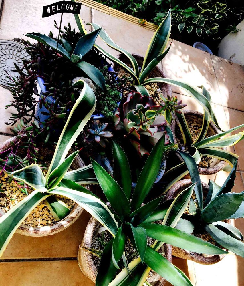 春に🇪🇸からお連れしたアガベさんたち全員集合‼︎悩んだあげく地植えから鉢植えにしたものの…心配していた盆休み前にしっかり根付いてくれました〜👍