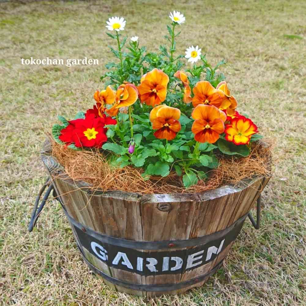 寒いから温かみのある色合いで寄せ植え。脇役の花達にこれ!っていうのが見つからないわぁ…なんかショボいのよねぇ。