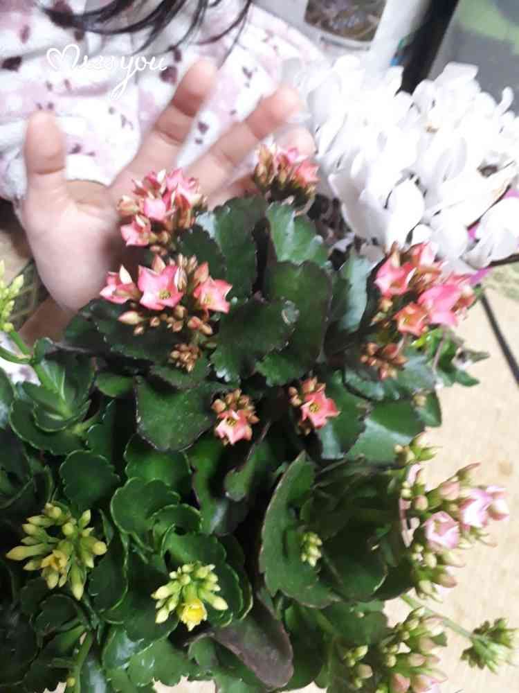 カランコエ 固いつぼみ 開きだしたよ〰 この前のシクラメンのゆきちゃんと一緒に… 娘の手… なぜか 一緒に写りたがる