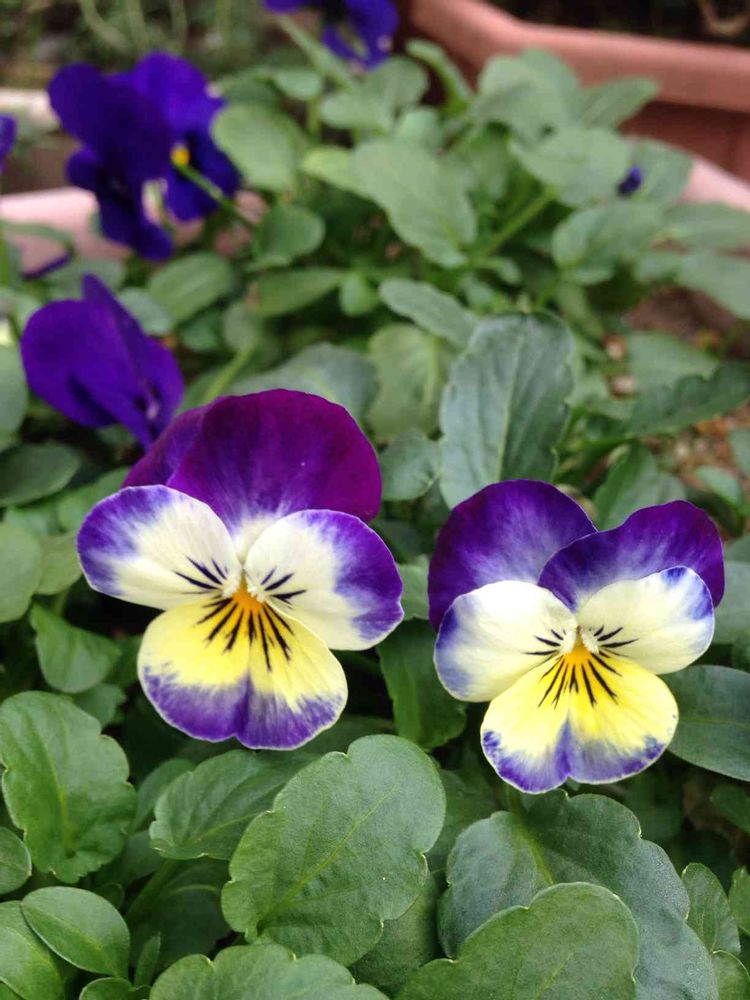 四角の鉢にこのビオラ2苗、紫2苗を色違いで植えてましたがなかなか花数が増えず、、
