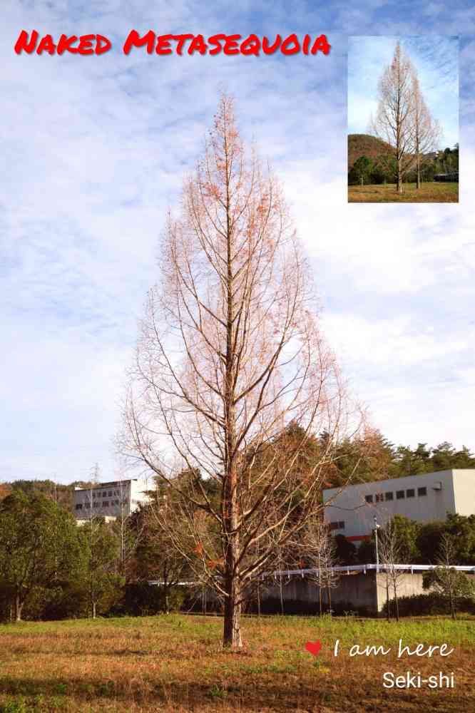 落葉したメタセコイアが、天をつくように立っている。🍁🍂🧡👍