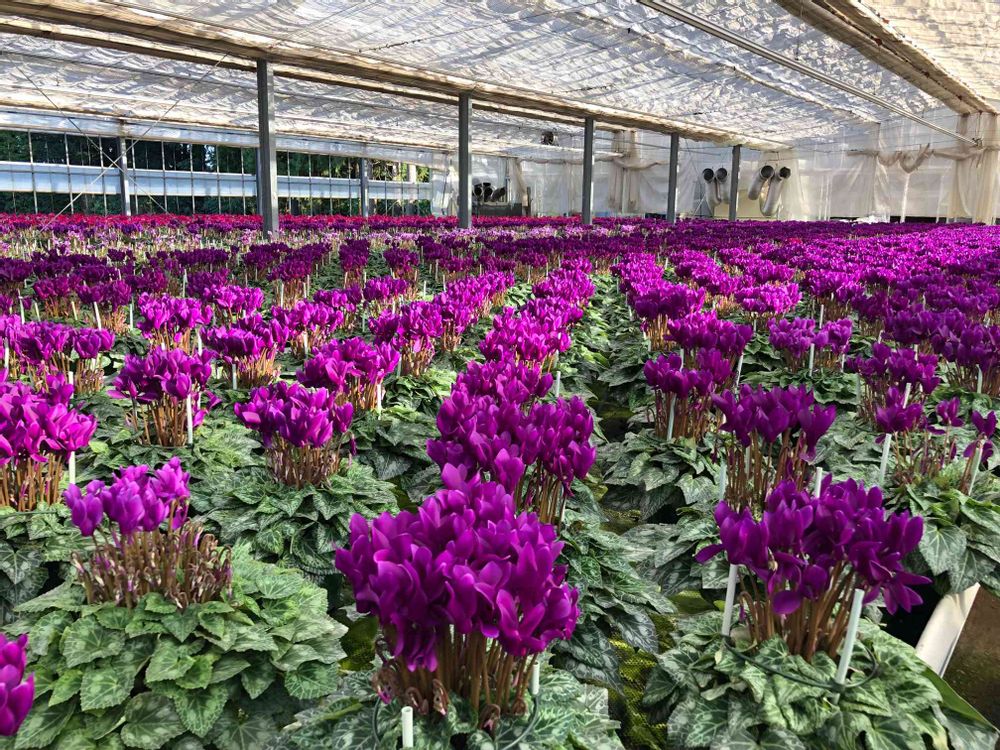 サントリーのブルーシクラメンを生産する高橋さんのハウス、整然と並んでいるシクラメン達凄いです‼️