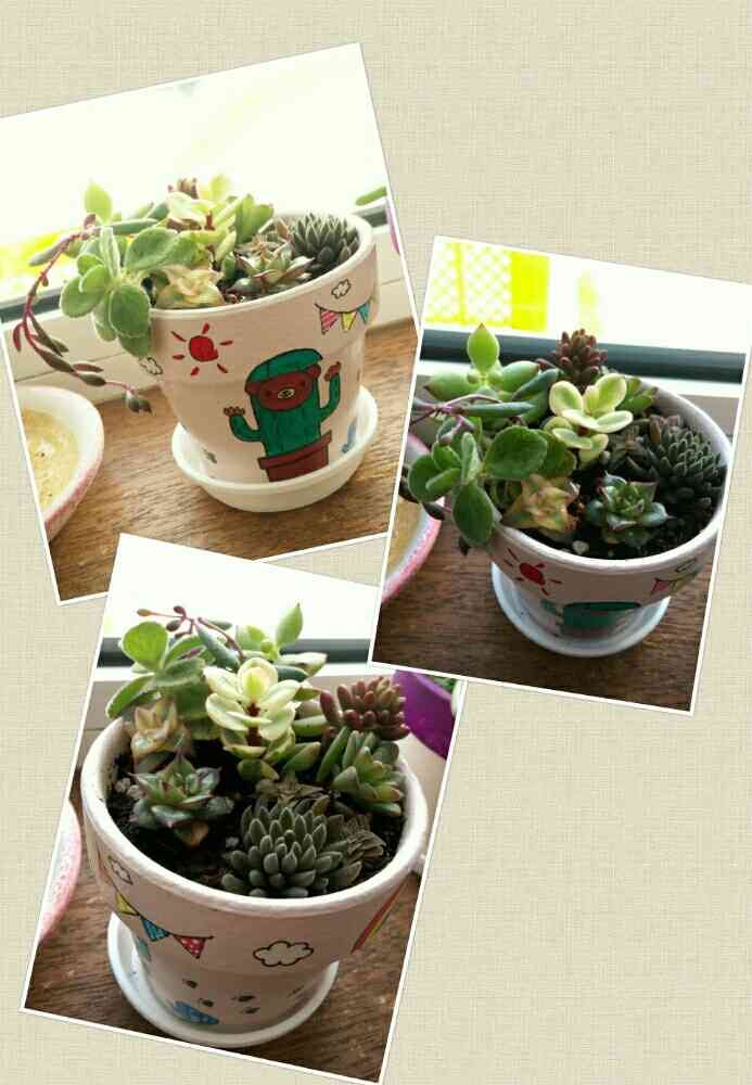 さぼくまタンリメ鉢にモノケロティス錦とニーナさんがオマケで入れてくれたミニ多肉セットを寄せ植えしました。別紙に多肉の名前を書いてくれましたがどれがどれだか分かりません(笑)