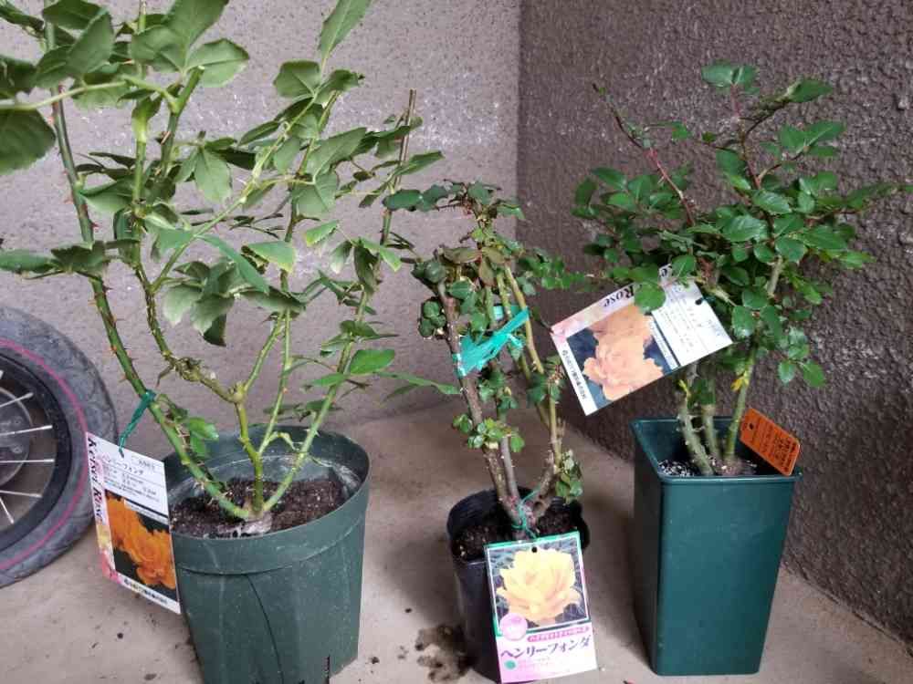左から、新苗木(京成バラ園、楽天通販)、2年生大苗(ノーブランド、楽天通販)、2年生大苗(京成バラ園、渋谷園芸で購入)