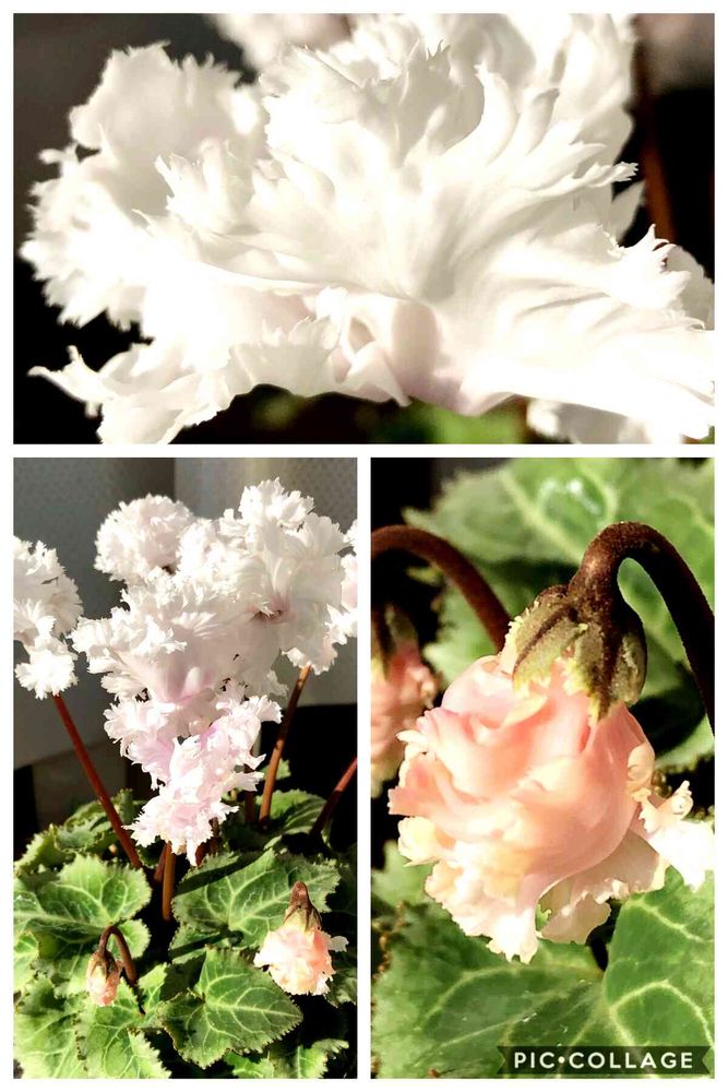 白のフリフリシクラメンとってもかわいいですねー💕💕💕蕾は少しピンクなんて、とっても好み😍😍😍