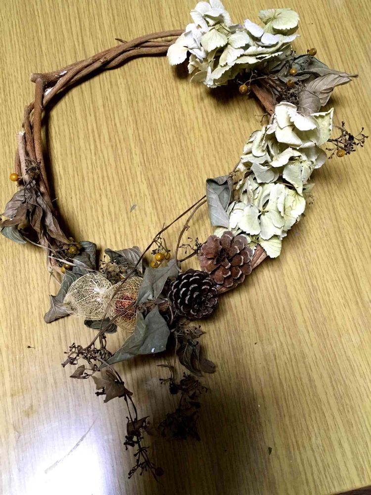 職場の藤棚の剪定の時に貰った藤の蔓を編んで、紫陽花、ヘクソカズラ、すかし鬼灯、松ぼっくり‥いかがでしょうか😅