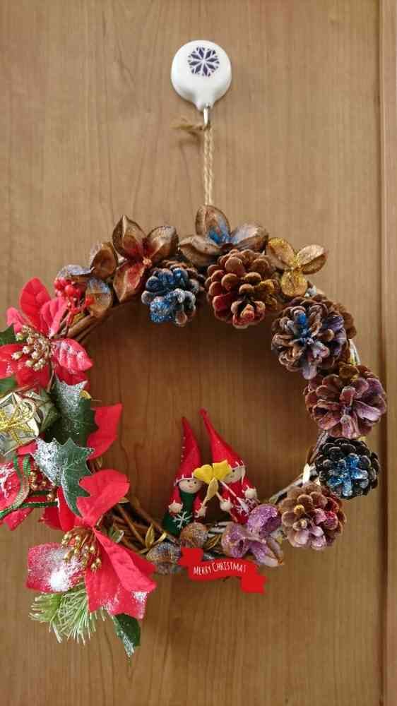 今年の我が家のクリスマスリース。保育園のお散歩で拾ってくるおみやげの松ぼっくりや木の実たちで毎年手作り。もちろんラメをふるのはちびさんたち(笑)merryChristmas⛄🎄
