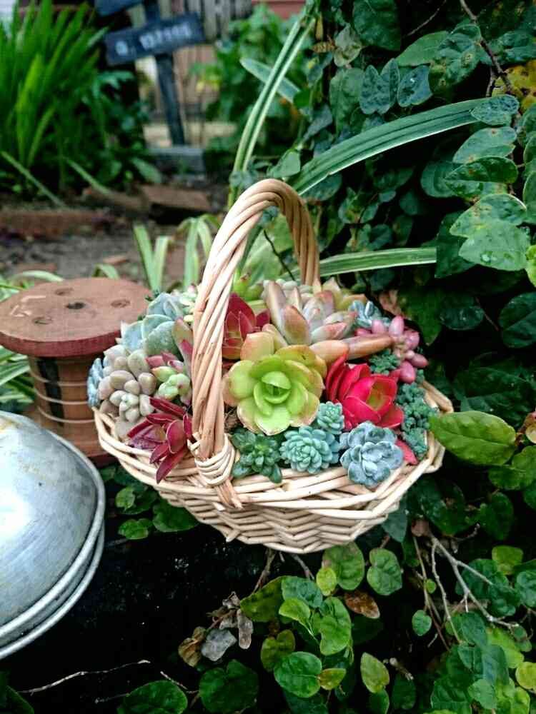 おはよう😄🎵可愛いカゴに、色とりどりの多肉の寄せ植え可愛い〜💕