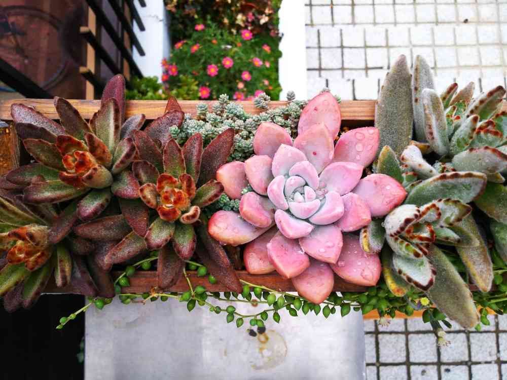 門の所に置いてある自作の木箱の鉢に植えた多肉たち🤗