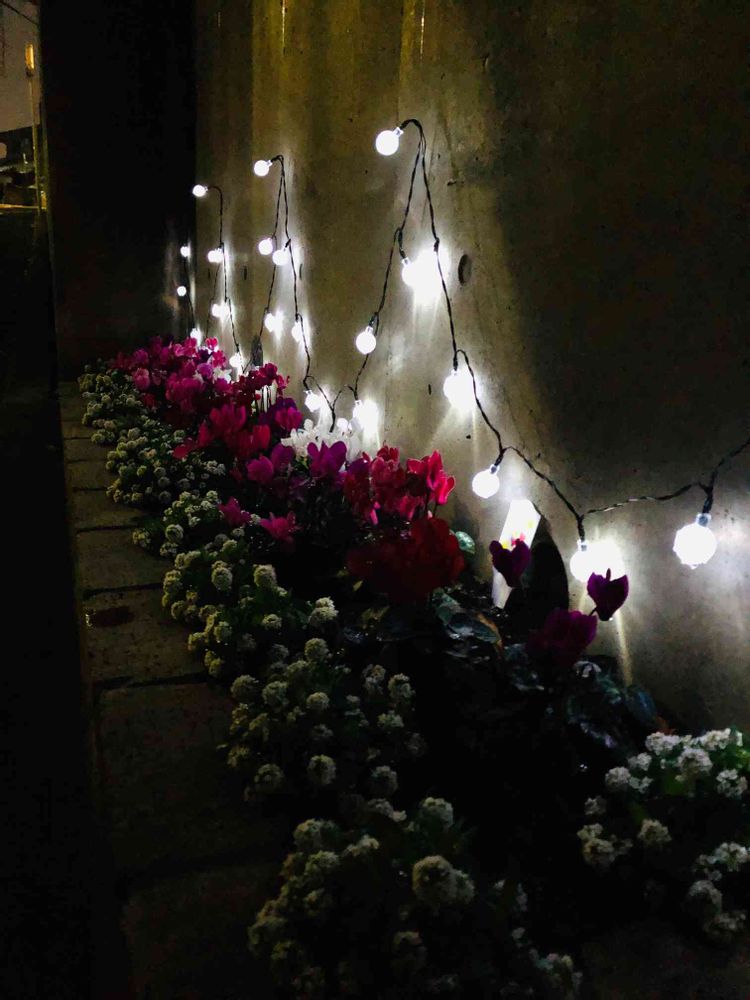 日暮れが早いこの時期でも、帰宅時に花を楽しむための工夫です。