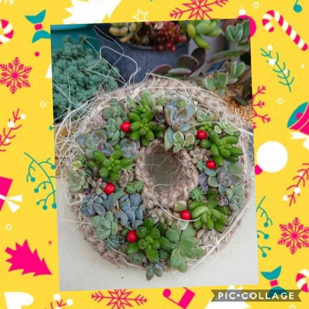 初めて編んだ麻のリースに、我が家の葉挿し達を入れて小さなリース作ってみました。