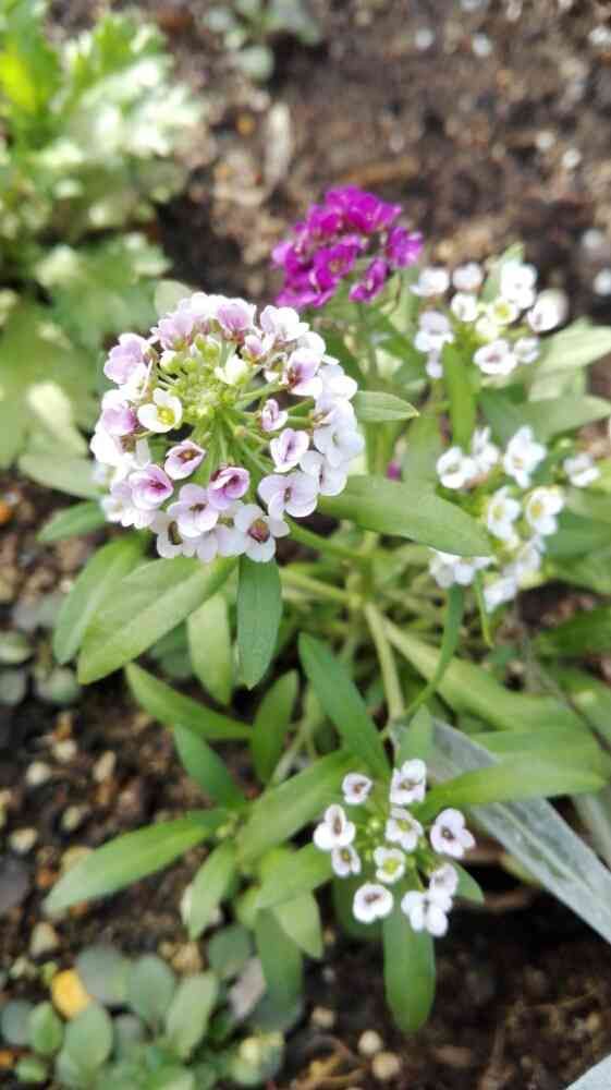 スイートアリッサムの白い子と、紫の子を近くに植えてたら、真ん中から白紫のダブルカラーというか、中央紫で花びらは白の子が出てきた😄