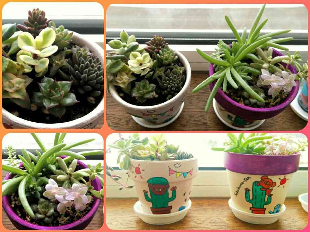 さぼくまタンリメ鉢。右側は抽選で当たった物。左側は特注でデザインして貰った物。どちらの多肉も元気に育ってます。