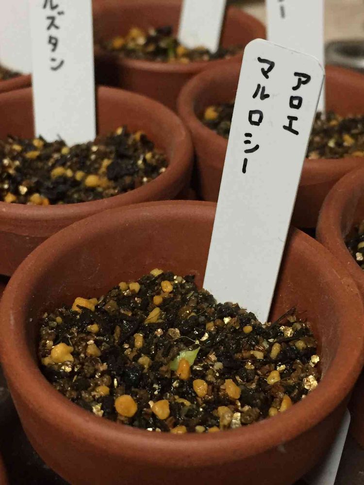 タネから出た玉みたいな根っこの中からアロエのとがった葉っぱが出てきた✨