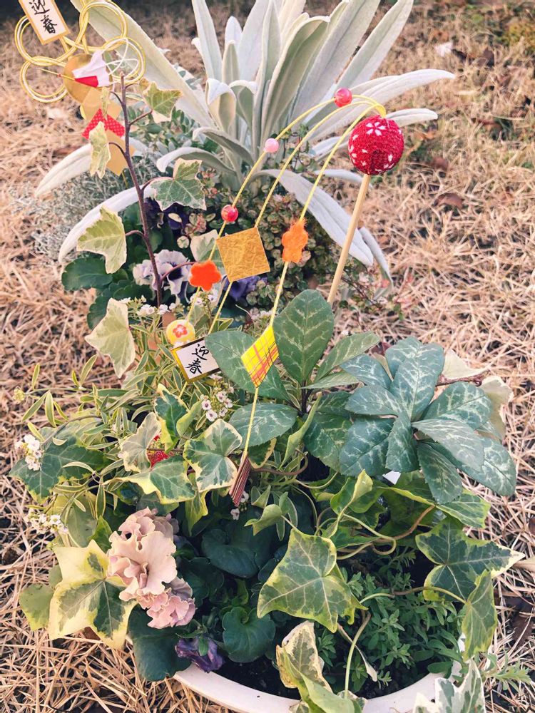 私は、先月作った葉牡丹の寄植えに、お飾り付けるだけの手抜きです(笑)