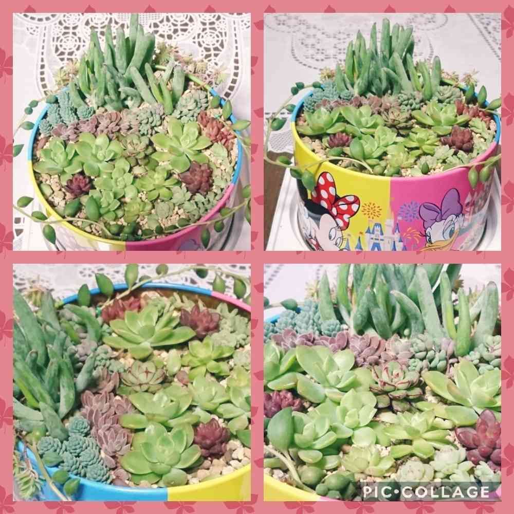 可愛いディズニーの空き缶に ちまちま寄せ植えしてみました🌱🌱🌱